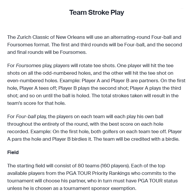 Die Zurich Classic of New Orleans ist das einzige Zwei-Mann-Team-Event auf dem PGA TOUR-Programm. Es starten 160 Spieler, die 80 Zwei-Mann-Teams bilden.